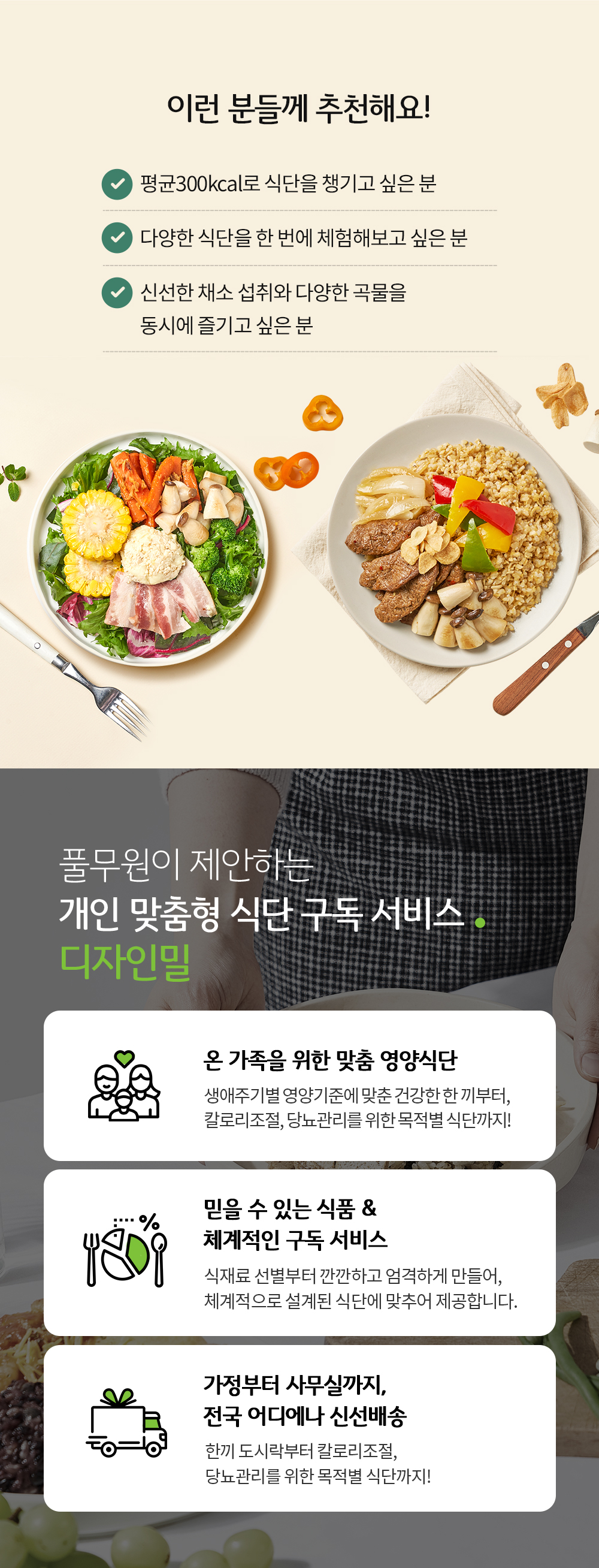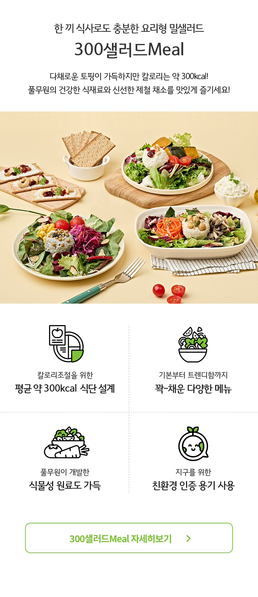 상품설명 상세정보 후기 (79) 기타안내 더보기 300샐러드Meal 상세구성 메뉴 사진을 클릭하면, 더 자세한 정보를 확인하실 수 있습니다. 그릴드베지두부텐더샐러드 숯불소이불고기유부채샐러드 베이컨&그릴드베지샐러드 보코치니단호박샐러드 칠리빈닭가슴살소시지샐러드 바싹불고기귀리샐러드 닭가슴살고구마샐러드 리코타통밀크레커샐러드 비트무샐러드 당근귀리무스샐러드 적채렌틸콩무스샐러드 Prev Next 300라이스Meal 상세구성 메뉴 사진을 클릭하면, 더 자세한 정보를 확인하실 수 있습니다. 새우라따뚜이덮밥 로스팅버섯강된장 소이짜장스크램블밥 닭가슴살소세지오므라이스 토마토양배추스테이크 칠리두부강정크림필라프 김치제육완두콩계란덮밥 소이불고기토마토야채덮밥 바질페스토새우덮밥 매쉬드두부토마토커리 Prev Next 식품의 유형 즉석섭취식품(300샐러드Meal,300라이스Meal) 제조원 및 생산자/소재지 (주)우리델리카 / 충청북도 진천군 덕산읍 신척산단 4로 6 유통전문 판매원 및 소재지 풀무원식품㈜/충북 음성군 대소면 삼양로 730-27 제조일자 상품 발송일 기준, 2일전 생산된 제품이 배달됩니다. ※ 주문 이후 각 생산공장에서 가장 최근에 생산된 제품을 준비하여 배송합니다. 소비기한 300샐러드Meal : 제조 시간으로부터 72시간, 300라이스Meal : 제조 시간으로부터 58시간 중량 및 구성 각 제품별 상이 원재료 및 함량 각 메뉴별 상세페이지 참조 유전자 재조합식품 여부 해당사항 없음 수입식품: 식품위생법에 따른 수입신고 여부 해당사항 없음 고객상담실 연락처 풀무원 고객기쁨센터 080-800-0434(수신자부담) 총 79 건 포토후기 베스트리뷰순 최신순 후기 더보기 배송안내 배송방법 새벽택배 (수도권, 충청 일부 지역) 또는 가맹점배송 (각 지역 풀무원녹즙 가맹점) 배송비 무료 (종이박스 배송) 첫 배송일 제품별로 주문일에 따른 첫 배달일이 다르오니 반드시 확인해주세요. 주문&변경 마감은 낮 12시입니다. (토,일,공휴일 제외) ※ 주문이 급증할 경우 조기마감되어 첫 배달일이 변경 될 수 있으며, 개별 안내드립니다. (문자 또는 알림톡) ※ 첫 주문시 가맹점의 모닝스텝이 배달정보 확인을 위해 고객님께 직접 연락드릴 수 있습니다. (전화 또는 문자) 배송형태 1. 새벽택배 2일치 식단이 한 번에 배송됩니다. 2. 가맹점배송 1일치 식단이 배송됩니다. 배송시간 1. 새벽택배 오전 7시 이전 도착 예정 2. 가맹점배송 가정 배달(주택/아파트) : 배달일 전날 12시~ 당일 오전 7시 사무실 배달(회사/공공기관/상가건물) : 배달 당일 오전 8시 ~ 오전 11시 ※ 악천후, 도로사정, 가맹점 상황(물량 급증, 현관출입 불가 등)에 따라 조기/지연 배달될 수 있습니다. 공휴일 배송안내 공휴일은 배송휴무입니다. - 칼로리/영양균형식 : 주문시점에 종료일 뒤로 자동 연장 됨 기타 가맹점배송 또는 새벽택배 배송이 불가능한 지역인 경우, 부득이하게 주문이 취소 될 수 있으며 개별 안내드립니다. 주문취소 1. 전체취소 ((가맹점배송)) 주문상품의 첫배송일 3일 전 낮 12시까지 전체 취소가 가능합니다. (토,일 및 공휴일 제외) ((택배배송)) 냉동/냉장/실온 택배 상품은 배송예정일 2일 전 낮 12시까지 전체취소 가능 ((원데이배송)) 주문상품의 배송일 3일 전 낮 12시까지 전체 취소가 가능합니다. (토,일 및 공휴일 제외) 2. 부분취소 ((가맹점배송)) 취소하는 요일과 시간에 따라 부분 취소가 가능합니다. (토,일 및 공휴일 제외) - 낮 12시 이전 취소 요청 시 : 3일 후 배송부터 부분취소 가능 - 낮 12시 이후 취소 요청 시 : 5일 후 배송부터 부분취소 가능 ((냉동/실온 택배배송)) 결제 완료 후 취소 시점에 따라 부분취소가 가능합니다. (주말, 공휴일 제외) - 낮 12시 이전 결제완료 후 취소 요청 시 : 주문마감되어 출고준비 상태로 취소 불가 - 낮 12시 이후 결제완료 후 취소 요청 시 : 익일 낮 12시까지 취소 접수 가능 취소하는 요일과 시간에 따라 부분 취소가 가능합니다. (토,일 및 공휴일 제외) ((원데이배송)) - 낮 12시 이전 취소 요청 시, 3일 후 배송 건부터 부분취소 가능 - 낮 12시 이후 취소 요청 시 : 영업일 기준 4일 후 배송 건부터 부분취소 가능 3. 공통 주문 시 쿠폰을 사용하였을 경우 ‘전체취소’ 시에만 원복 됩니다. 교환/반품안내 교환/반품 신청은 실온 택배배송 상품만 가능합니다. * 상품 불량 외 택배 포장 파손은 교환/반품 사유가 되지 않습니다. - 고객님의 변심에 의한 교환/반품의 경우 반송 택배비를 고객님께서 부담하셔야 합니다. (무료배송 시 왕복택배비) - 임의로 반송하실 경우 환불 등의 처리가 지연될 수 있으므로 반송 전 꼭 1:1문의 또는 고객센터로 접수해 주시기 바랍니다. [반품 가능 조건] 1. 단순변심, 주문착오의 경우 (1) 냉동/냉장/신선 즉섭섭취 상품은 재판매가 불가한 상품 특성 상 반품이 불가합니다. (2) 상온상품은 배송완료 후 7일 이내에 반품 신청이 가능합니다. ※ 고객의 단순변심 또는 주문착오로 인한 반품건의 왕복 배송비는 고객님 부담이며, 상품에 따라 상이 할 수 있습니다. (주문 시 배송비를 결제한 경우 반품 배송비만 부담) ※ 반품한 경우 결제 시 사용 한 쿠폰은 재발행 되지 않습니다. 2. 제품 하