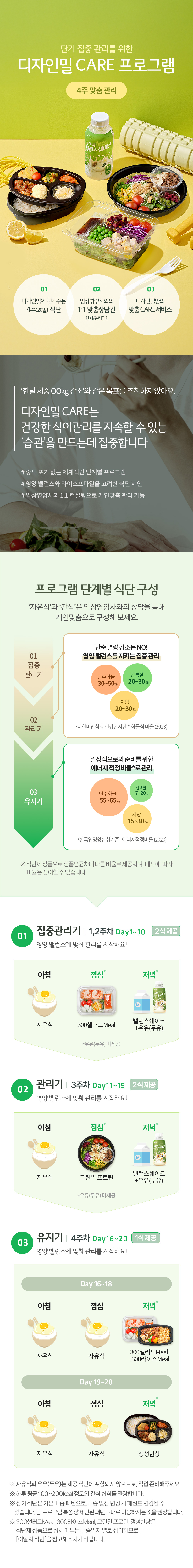 상품설명 상세정보 후기 (13) 기타안내 더보기 300샐러드Meal 상세구성 이미지를 클릭하면, 더 자세한 정보를 확인하실 수 있습니다. 그릴드베지두부텐더샐러드 숯불소이불고기유부채샐러드 베이컨&그릴드베지샐러드 보코치니단호박샐러드 칠리빈닭가슴살소시지샐러드 바싹불고기귀리샐러드 닭가슴살고구마샐러드 리코타통밀크레커샐러드 비트무샐러드 당근귀리무스샐러드 적채렌틸콩무스샐러드 Prev Next 300라이스Meal 상세구성 이미지를 클릭하면, 더 자세한 정보를 확인하실 수 있습니다. 새우라따뚜이덮밥 로스팅버섯강된장 소이짜장스크램블밥 닭가슴살소세지오므라이스 토마토양배추스테이크 칠리두부강정크림필라프 김치제육완두콩계란덮밥 소이불고기토마토야채덮밥 바질페스토새우덮밥 매쉬드두부토마토커리 Prev Next 그린밀프로틴 상세구성 이미지를 클릭하면, 더 자세한 정보를 확인하실 수 있습니다. 비트라페&단호박오리구이 적채라페&닭가슴살고구마 칠리빈&통옥수수닭가슴살소세지 당근라페&불고기두부구이 아보카도&달콤닭가슴살 연두부무스&숯불소이불고기 비트무&에그피자 오이타르&닭가슴살 풀드포크&홀그레인양배추 고추라페&고추장제육 바베큐치킨&레몬오이라페 Prev Next 정성한상 상세구성 이미지를 클릭하면, 더 자세한 정보를 확인하실 수 있습니다. 두툼떡갈비 정식 소불고기전골 정식 숯불닭구이 정식 큐브스테이크 정식 씨앗강된장 정식 두부제육 정식 바싹소불고기 비빔밥 간장찜닭 정식 오리바베큐 정식 통채소새우카레 정식 함박스테이크정식 숯불소이무나물비빔밥 시래기비빔밥 두부라구정식 Prev Next 식품의 유형 300샐러드Meal,300라이스Meal,정성한상,그린밀 프로틴:즉석섭취식품밸런스쉐이크:기타가공품 제조원 및 소재지 300샐러드Meal,300라이스Meal,정성한상,그린밀프로틴 :㈜우리델리카 / 충청북도 진천군 덕산읍 신척산단 4로 밸런스쉐이크:(주)비엘에프씨 / 경북 상주시 함창읍 영동길 9-67 유통전문 판매원 및 소재지 풀무원식품㈜ / 충북 음성군 대소면 삼양로 730-27 수입품의 경우 수입자 해당사항 없음 제조일자 300샐러드Meal,300라이스Meal,정성한상,그린밀 프로틴:상품 발송일 기준, 2일전 생산된 제품이 배달됩니다밸런스쉐이크: 수령일 기준 잔여 유통기한 3개월 이상 남은 제품이 배달됩니다. ※ 주문 이후 각 생산공장에서 가장 최근에 생산된 제품을 준비하여 배송합니다. 소비기한 300샐러드Meal,그린밀 프로틴:제조시간으로부터 72시간 이내300라이스Meal,정성한상: 제조시간으로부터 58시간 이내 밸런스쉐이크:365일 중량 및 구성 각 메뉴별 상이 원재료 및 함량 각 메뉴별 상세페이지 참조 유전자 재조합식품 여부 해당사항 없음 수입식품 및 식품위생법에 따른 수입신고 여부 해당사항 없음 고객상담실 연락처 080-800-0434(수신자부담) 식단구성 ※ 자유식과 우유(두유)는 제공 식단에 포함되지 않으므로, 직접 준비해주세요. ※ 하루 평균 100~200kcal 정도의 간식 섭취를 권장합니다. 배송메뉴 ※ 300샐러드Meal, 300라이스Meal, 그린밀 프로틴, 정성한상은 식단제 상품으로 상세 메뉴는 배송일자 별로 상이하므로, [이달의 식단]을 참고해주시기 바랍니다. ※ 식단제 상품으로 상품평균차에 따른 비율로 제공되며, 메뉴에 따라 비율은 상이할 수 있습니다. 유의사항 1 프로그램 식단의 일부 주차는 열량이 낮게 설계되어 임산부, 수유부는 섭취를 권장하지 않습니다. 디자인밀은 1일 1메뉴를 제공하므로, 해당 배송일에 다른 메뉴로 대체는 불가능합니다. 유의사항 2 배송일 중 원하지 않는 메뉴가 포함되는 경우, 로그인 후 마이페이지 - 주문내역 - 배송일정 변경으로 들어가시면 직접 배송일 변경이 가능합니다. 단, 프로그램 특성 상 제안된 패턴 그대로 이용하시는 것을 권장합니다. 유의사항 3 본 상품은 맞춤상담을 위한 상담권 1개가 필수 구성으로 포함되어있습니다. 상담권 이용은 선택사항이나, 상담권만 환불은 불가합니다. (상담권은 어떠한 경우에도 현금 환불되지 않습니다.) 총 13 건 포토후기 베스트리뷰순 최신순 후기 더보기 배송안내 배송방법 새벽택배 (수도권, 충청 일부 지역) 또는 가맹점배송 (각 지역 풀무원녹즙 가맹점) 배송비 무료 (종이박스 배송) 첫 배송일 제품별로 주문일에 따른 첫 배달일이 다르오니 반드시 확인해주세요. 주문&변경 마감은 낮 12시입니다. (토,일,공휴일 제외) ※ 주문이 급증할 경우 조기마감되어 첫 배달일이 변경 될 수 있으며, 개별 안내드립니다. (문자 또는 알림톡) ※ 첫 주문시 가맹점의 모닝스텝이 배달정보 확인을 위해 고객님께 직접 연락드릴 수 있습니다. (전화 또는 문자) 배송변경 디자인밀 식단형 상품의 첫배송일은 주문일로부터 30일 이내 선택, 이용 중 변경은 첫배송일로부터 +100일 이내 일정에서 변경 가능합니다. 배송형태 1. 새벽택배 2일치 식단이 한 번에 배송됩니다. 2. 가맹점배송 1일치 식단이 배송됩니다. 배송시간 1. 새벽택배 오전 7시 이전 도착 예정 2. 가맹점배송 가정 배달(주택/아파트) : 배달일 전날 12시~ 당일 오전 7시 사무실 배달(회사/공공기관/상가건물) : 배달 당일 오전 8시 ~ 오전 11시 ※ 악천후, 도로사정,