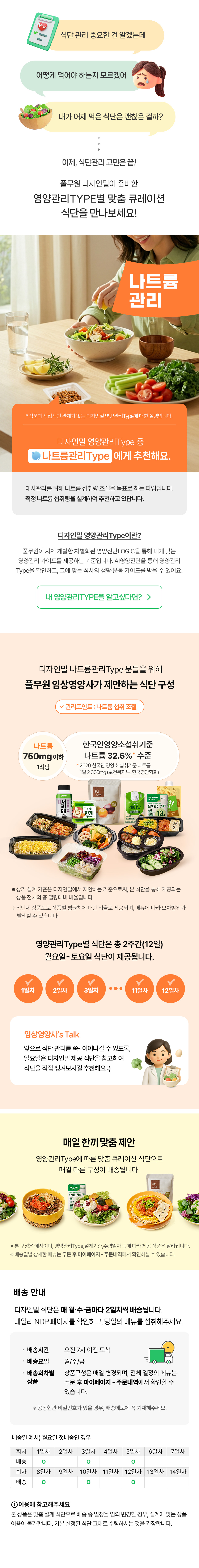 상품설명 상세정보 후기 (0) 기타안내 더보기 나트륨관리Type 큐레이션 식단 상세구성 이미지를 클릭하면, 더 자세한 정보를 확인하실 수 있습니다. 칠리빈닭가슴살소시지샐러드 닭가슴살소세지오므라이스 두부제육정식 비트무샐러드 미니샐러드 레드 투움바파스타정식 참깨쯔유찜샐러드 칠리오일찜샐러드 버진올리브유찜샐러드 김치제육완두콩계란덮밥 바질페스토새우덮밥 매쉬드두부토마토커리 K스파이시찜샐러드 피넛버터찜샐러드 Prev Next 케어유 고단백 균형영양식 케어유 고단백 당뇨영양식 한끼연두부 오리엔탈유자 찐밤 그대로 핸디밀포켓쉐이크 고소한맛50g 단백한하루 15곡 저당 Prev Next 식품의 유형 상품 상세 정보를 참고하세요. 제조원 및 생산자/소재지 상품 상세 정보를 참고하세요. 유통전문 판매원 및 소재지 상품 상세 정보를 참고하세요. 제조일자 식단은 상품 발송일 기준, 2일전 생산된 제품이 배달됩니다. ※ 주문 이후 각 생산공장에서 가장 최근에 생산된 제품을 준비하여 배송합니다. 국산생나또,한끼연두부,구운란은 상품 발송일을 기준으로 소비기한이 5일 이상 남은 제품이 배송됩니다. 그 외 제품은 상품 발송일을 기준으로 소비기한이 30일 이상 남은 상품만을 판매합니다. ※ 뉴트리션디자인프로그램은 각 상품마다 배송되는 상품이 상이합니다. 소비기한 300샐러드Meal/무수분찜샐러드/그린밀프로틴 : 제조시간으로부터 72시간, 300라이스Meal,저당고단백밀,정성한상&미니샐러드 : 제조시간으로부터 58시간, 그 외 제품은 상품 상세 정보를 확인해주세요. 중량 및 구성 각 제품별 상이 원재료 및 함량 각 메뉴별 상세페이지 참조 유전자 재조합식품 여부 해당사항 없음 수입식품: 식품위생법에 따른 수입신고 여부 해당사항 없음 고객상담실 연락처 풀무원 고객기쁨센터 080-800-0434(수신자부담) 총 0 건 포토후기 베스트리뷰순 최신순 후기 더보기 배송안내 배송방법 새벽택배 (서울 전지역) 배송비 무료 (종이박스 배송) 첫 배송일 고객님이 선택하신 프로그램 시작일에 맞추어 배송됩니다. 단, 뉴트리션 디자인 프로그램 구매 시, 사전패키지 (가이드&연속혈당측정기)는 프로그램 시작일로부터 2일 전 배송됩니다. (월요일 배송인 경우, 금요일 배송) ※ 주문이 급증할 경우 조기마감되어 프로그램 시작일이 변경 될 수 있으며, 개별 안내드립니다. (문자 또는 알림톡) 배송변경 본 상품은 관리형 프로그램으로 선택하신 이용일 그대로 이용하시길 권장합니다. 단, 부득이한 사정으로 식단 수령일의 변경이 필요한 경우, 프로그램 시작일로부터 3주(21일) 이내 일정에서 변경이 가능합니다. 배송형태 2일치 식단이 한 번에 배송 됩니다. 배송시간 오전 7시 이전 도착 예정 ※ 악천후, 도로상황에 따라 지연 배달될 수 있습니다. 공휴일 배송안내 공휴일은 배송휴무입니다. 주문 시점에 종료일 뒤로 자동 연장 및 변경되어 배송일이 설정됩니다. 주문취소 1. 전체취소 주문상품의 프로그램 시작일 4일 전 낮 12시까지 전체 취소가 가능합니다. (토,일 및 공휴일 제외) 2. 부분취소 본 상품은 이용 중 부분 취소는 불가합니다. 3. 공통 주문 시 쿠폰을 사용하였을 경우 ‘전체취소’ 시에만 원복 됩니다. 연속혈당측정기 센서 오류가 있는 경우 *리브레 앱 좌측 상단에 있는 메뉴에서 아래 화면 캡처 ① 센서 serial number(메뉴-정보), ② 오류 증상 화면(메뉴-도움말-이벤트로그) ③ 부착 일자(메뉴-도움말-이벤트로그 내 새로운 센서 발견 메시지 참조) 다음의 경우는 교환 및 환불이 불가합니다. 1. 구매자의 과실로 기기가 파손, 훼손된 경우 2. 센서 오류 메시지 확인이 어려워 센서 오류 판단이 어려운 경우 3. 구매자의 과실로 센서가 떨어져 재사용이 어려운 경우 교환/반품안내 교환/반품 신청은 실온 택배배송 상품만 가능합니다. * 상품 불량 외 택배 포장 파손은 교환/반품 사유가 되지 않습니다. - 고객님의 변심에 의한 교환/반품의 경우 반송 택배비를 고객님께서 부담하셔야 합니다. (무료배송 시 왕복택배비) - 임의로 반송하실 경우 환불 등의 처리가 지연될 수 있으므로 반송 전 꼭 1:1문의 또는 고객센터로 접수해 주시기 바랍니다. [반품 가능 조건] 1. 단순변심, 주문착오의 경우 (1) 냉동/냉장/신선 즉섭섭취 상품은 재판매가 불가한 상품 특성 상 반품이 불가합니다. (2) 상온상품은 배송완료 후 7일 이내에 반품 신청이 가능합니다. ※ 고객의 단순변심 또는 주문착오로 인한 반품건의 왕복 배송비는 고객님 부담이며, 상품에 따라 상이 할 수 있습니다. (주문 시 배송비를 결제한 경우 반품 배송비만 부담) ※ 반품한 경우 결제 시 사용 한 쿠폰은 재발행 되지 않습니다. 2. 제품 하자의 경우 반드시 상품의 문제를 확인할 수 있는 사진을 첨부하여 반품 신청하셔야 합니다. *사진 첨부 시, 제품의 유통기한 또는 소비기한을 확인할 수 있는 사진 1장과 제품의 하자가 있는 부분에 대한 사진 1~2장 같이 첨부 (1) 냉동/냉장/신선식품 : 상품을 받은 날로부터 2일 이내 (2) 상온상품 : 상품을 받은 날로부터 3개월 이내 또는 사실을 알게 된 날로부터 30일 이내 ※ 반품 배송비는 디자인밀에서 부담하며 실물 확인 후 환