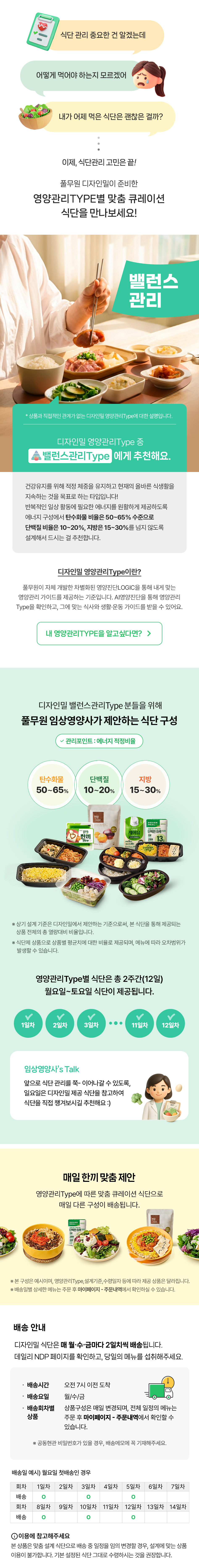 상품설명 상세정보 후기 (0) 기타안내 더보기 밸런스관리Type 큐레이션 식단 상세구성 이미지를 클릭하면, 더 자세한 정보를 확인하실 수 있습니다. 두툼떡갈비 정식 숯불닭구이 정식 씨앗강된장 정식 두부제육 정식 바싹소불고기 비빔밥 간장찜닭 정식 매콤제육정식 토마토스튜&호밀빵 정식 미니샐러드 레드 미니샐러드 레드 미니샐러드 옐로우 미니샐러드 옐로우 미니샐러드 옐로우 미니샐러드 옐로우 미니샐러드 그린 미니샐러드 그린 미니샐러드 그린 미니샐러드 그린 칠리두부강정크림필라프 김치제육완두콩계란덮밥 적채렌틸콩무스샐러드 구운마늘훈제오리정식 매쉬드두부토마토커리 숯불소이무나물비빔밥 바베큐치킨&레몬오이라페 두부라구정식 시래기비빔밥 만두버섯전골정식 미니샐러드 화이트 소불고기전골정식 Prev Next 서리태 콩즙두유 (단품) 케어유 고단백 균형영양식 한끼연두부 오리엔탈유자 찐밤 그대로 단백한하루 15곡 저당 Prev Next 식품의 유형 상품 상세 정보를 참고하세요. 제조원 및 생산자/소재지 상품 상세 정보를 참고하세요. 유통전문 판매원 및 소재지 상품 상세 정보를 참고하세요. 제조일자 식단은 상품 발송일 기준, 2일전 생산된 제품이 배달됩니다. ※ 주문 이후 각 생산공장에서 가장 최근에 생산된 제품을 준비하여 배송합니다. 국산생나또,한끼연두부,구운란은 상품 발송일을 기준으로 소비기한이 5일 이상 남은 제품이 배송됩니다. 그 외 제품은 상품 발송일을 기준으로 소비기한이 30일 이상 남은 상품만을 판매합니다. ※ 뉴트리션디자인프로그램은 각 상품마다 배송되는 상품이 상이합니다. 소비기한 300샐러드Meal/무수분찜샐러드/그린밀프로틴 : 제조시간으로부터 72시간, 300라이스Meal,저당고단백밀,정성한상&미니샐러드 : 제조시간으로부터 58시간, 그 외 제품은 상품 상세 정보를 확인해주세요. 중량 및 구성 각 제품별 상이 원재료 및 함량 각 메뉴별 상세페이지 참조 유전자 재조합식품 여부 해당사항 없음 수입식품: 식품위생법에 따른 수입신고 여부 해당사항 없음 고객상담실 연락처 풀무원 고객기쁨센터 080-800-0434(수신자부담) 총 0 건 포토후기 베스트리뷰순 최신순 후기 더보기 배송안내 배송방법 새벽택배 (서울 전지역) 배송비 무료 (종이박스 배송) 첫 배송일 고객님이 선택하신 프로그램 시작일에 맞추어 배송됩니다. 단, 뉴트리션 디자인 프로그램 구매 시, 사전패키지 (가이드&연속혈당측정기)는 프로그램 시작일로부터 2일 전 배송됩니다. (월요일 배송인 경우, 금요일 배송) ※ 주문이 급증할 경우 조기마감되어 프로그램 시작일이 변경 될 수 있으며, 개별 안내드립니다. (문자 또는 알림톡) 배송변경 본 상품은 관리형 프로그램으로 선택하신 이용일 그대로 이용하시길 권장합니다. 단, 부득이한 사정으로 식단 수령일의 변경이 필요한 경우, 프로그램 시작일로부터 3주(21일) 이내 일정에서 변경이 가능합니다. 배송형태 2일치 식단이 한 번에 배송 됩니다. 배송시간 오전 7시 이전 도착 예정 ※ 악천후, 도로상황에 따라 지연 배달될 수 있습니다. 공휴일 배송안내 공휴일은 배송휴무입니다. 주문 시점에 종료일 뒤로 자동 연장 및 변경되어 배송일이 설정됩니다. 주문취소 1. 전체취소 주문상품의 프로그램 시작일 4일 전 낮 12시까지 전체 취소가 가능합니다. (토,일 및 공휴일 제외) 2. 부분취소 본 상품은 이용 중 부분 취소는 불가합니다. 3. 공통 주문 시 쿠폰을 사용하였을 경우 ‘전체취소’ 시에만 원복 됩니다. 연속혈당측정기 센서 오류가 있는 경우 *리브레 앱 좌측 상단에 있는 메뉴에서 아래 화면 캡처 ① 센서 serial number(메뉴-정보), ② 오류 증상 화면(메뉴-도움말-이벤트로그) ③ 부착 일자(메뉴-도움말-이벤트로그 내 새로운 센서 발견 메시지 참조) 다음의 경우는 교환 및 환불이 불가합니다. 1. 구매자의 과실로 기기가 파손, 훼손된 경우 2. 센서 오류 메시지 확인이 어려워 센서 오류 판단이 어려운 경우 3. 구매자의 과실로 센서가 떨어져 재사용이 어려운 경우 교환/반품안내 교환/반품 신청은 실온 택배배송 상품만 가능합니다. * 상품 불량 외 택배 포장 파손은 교환/반품 사유가 되지 않습니다. - 고객님의 변심에 의한 교환/반품의 경우 반송 택배비를 고객님께서 부담하셔야 합니다. (무료배송 시 왕복택배비) - 임의로 반송하실 경우 환불 등의 처리가 지연될 수 있으므로 반송 전 꼭 1:1문의 또는 고객센터로 접수해 주시기 바랍니다. [반품 가능 조건] 1. 단순변심, 주문착오의 경우 (1) 냉동/냉장/신선 즉섭섭취 상품은 재판매가 불가한 상품 특성 상 반품이 불가합니다. (2) 상온상품은 배송완료 후 7일 이내에 반품 신청이 가능합니다. ※ 고객의 단순변심 또는 주문착오로 인한 반품건의 왕복 배송비는 고객님 부담이며, 상품에 따라 상이 할 수 있습니다. (주문 시 배송비를 결제한 경우 반품 배송비만 부담) ※ 반품한 경우 결제 시 사용 한 쿠폰은 재발행 되지 않습니다. 2. 제품 하자의 경우 반드시 상품의 문제를 확인할 수 있는 사진을 첨부하여 반품 신청하셔야 합니다. *사진 첨부 시, 제품의 유통기한 또는 소비기한을 확인할 수 있는 사진 1장과 제