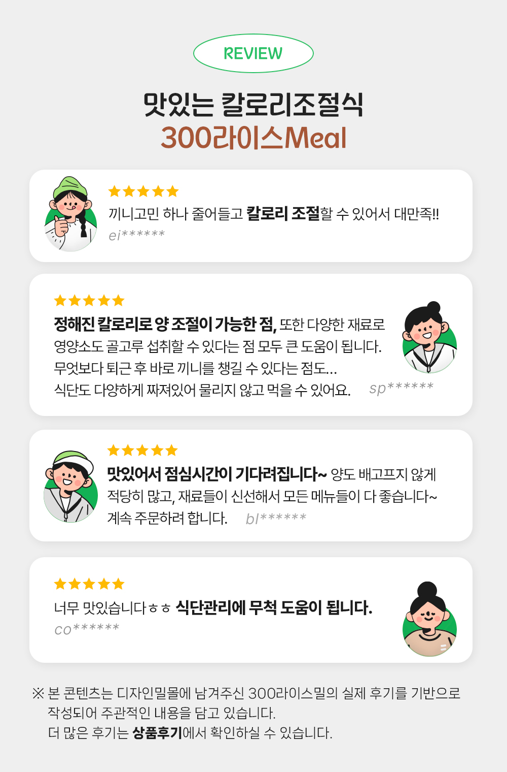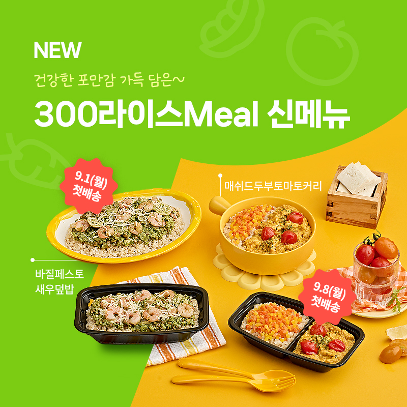 상품설명 상세정보 후기 (269) 기타안내 더보기 300라이스Meal 상세구성 메뉴 사진을 클릭하면, 더 자세한 정보를 확인하실 수 있습니다. 새우라따뚜이덮밥 로스팅버섯강된장 소이짜장스크램블밥 닭가슴살소세지오므라이스 토마토양배추스테이크 칠리두부강정크림필라프 김치제육완두콩계란덮밥 소이불고기토마토야채덮밥 바질페스토새우덮밥 매쉬드두부토마토커리 Prev Next 식품의 유형 즉석섭취식품 제조원 및 생산자 ㈜우리델리카 / 충청북도 진천군 덕산읍 신척산단 4로 6 유통전문 판매원 및 소재지 풀무원식품㈜ / 충북 음성군 대소면 삼양로 730-27 수입품의 경우 수입자 해당사항 없음 제조일자 상품 발송일 기준, 2일전 생산된 제품이 배달됩니다. ※ 주문 이후 각 생산공장에서 가장 최근에 생산된 제품을 준비하여 배송합니다. 소비기한 제조 시간으로 부터 58시간 이내 중량 및 구성 각 제품별 250g 미만(평균 220g) 원재료 및 함량 각 메뉴별 상세페이지 참조 유전자 재조합식품 여부 해당사항 없음 소비자 안전을 위한 주의사항 반드시 냉장보관하시고, 개봉 후에는 가능한 빨리 드십시오.용기 및 포장지가 날카로우니 개봉 및 사용 시 주의하시기 바랍니다. 수입식품: 식품위생법에 따른 수입신고 여부 해당사항 없음 고객상담실 연락처 풀무원 고객기쁨센터 080-800-0434(수신자부담) 유의사항 칼로리 조절 식단은 열량이 낮게 설계되어 임산부, 수유부는 섭취를 권장하지 않습니다.디자인밀은 1일 1메뉴를 제공하므로, 해당 배송일에 다른 메뉴로 대체는 불가능합니다. 배송일 중 원하지 않는 메뉴가 포함되는 경우, 로그인 후 '마이페이지 > 배송캘린더 > 배송일정 변경' 으로 들어가시면 직접 배송일 변경이 가능합니다. 총 269 건 포토후기 베스트리뷰순 최신순 후기 더보기 배송안내 배송방법 새벽택배 (수도권, 충청 일부 지역) 또는 가맹점배송 (각 지역 풀무원녹즙 가맹점) 배송비 무료 (종이박스 배송) 첫 배송일 제품별로 주문일에 따른 첫 배달일이 다르오니 반드시 확인해주세요. 주문&변경 마감은 낮 12시입니다. (토,일,공휴일 제외) ※ 주문이 급증할 경우 조기마감되어 첫 배달일이 변경 될 수 있으며, 개별 안내드립니다. (문자 또는 알림톡) ※ 첫 주문시 가맹점의 모닝스텝이 배달정보 확인을 위해 고객님께 직접 연락드릴 수 있습니다. (전화 또는 문자) 배송형태 1. 새벽택배 2일치 식단이 한 번에 배송됩니다. 2. 가맹점배송 1일치 식단이 배송됩니다. 배송시간 1. 새벽택배 오전 7시 이전 도착 예정 2. 가맹점배송 가정 배달(주택/아파트) : 배달일 전날 12시~ 당일 오전 7시 사무실 배달(회사/공공기관/상가건물) : 배달 당일 오전 8시 ~ 오전 11시 ※ 악천후, 도로사정, 가맹점 상황(물량 급증, 현관출입 불가 등)에 따라 조기/지연 배달될 수 있습니다. 공휴일 배송안내 공휴일은 배송휴무입니다. - 칼로리/영양균형식 : 주문시점에 종료일 뒤로 자동 연장 됨 기타 가맹점배송 또는 새벽택배 배송이 불가능한 지역인 경우, 부득이하게 주문이 취소 될 수 있으며 개별 안내드립니다. 주문취소 1. 전체취소 ((가맹점배송)) 주문상품의 첫배송일 3일 전 낮 12시까지 전체 취소가 가능합니다. (토,일 및 공휴일 제외) ((택배배송)) 냉동/냉장/실온 택배 상품은 배송예정일 2일 전 낮 12시까지 전체취소 가능 ((원데이배송)) 주문상품의 배송일 3일 전 낮 12시까지 전체 취소가 가능합니다. (토,일 및 공휴일 제외) 2. 부분취소 ((가맹점배송)) 취소하는 요일과 시간에 따라 부분 취소가 가능합니다. (토,일 및 공휴일 제외) - 낮 12시 이전 취소 요청 시 : 3일 후 배송부터 부분취소 가능 - 낮 12시 이후 취소 요청 시 : 5일 후 배송부터 부분취소 가능 ((냉동/실온 택배배송)) 결제 완료 후 취소 시점에 따라 부분취소가 가능합니다. (주말, 공휴일 제외) - 낮 12시 이전 결제완료 후 취소 요청 시 : 주문마감되어 출고준비 상태로 취소 불가 - 낮 12시 이후 결제완료 후 취소 요청 시 : 익일 낮 12시까지 취소 접수 가능 취소하는 요일과 시간에 따라 부분 취소가 가능합니다. (토,일 및 공휴일 제외) ((원데이배송)) - 낮 12시 이전 취소 요청 시, 3일 후 배송 건부터 부분취소 가능 - 낮 12시 이후 취소 요청 시 : 영업일 기준 4일 후 배송 건부터 부분취소 가능 3. 공통 주문 시 쿠폰을 사용하였을 경우 ‘전체취소’ 시에만 원복 됩니다. 교환/반품안내 교환/반품 신청은 실온 택배배송 상품만 가능합니다. * 상품 불량 외 택배 포장 파손은 교환/반품 사유가 되지 않습니다. - 고객님의 변심에 의한 교환/반품의 경우 반송 택배비를 고객님께서 부담하셔야 합니다. (무료배송 시 왕복택배비) - 임의로 반송하실 경우 환불 등의 처리가 지연될 수 있으므로 반송 전 꼭 1:1문의 또는 고객센터로 접수해 주시기 바랍니다. [반품 가능 조건] 1. 단순변심, 주문착오의 경우 (1) 냉동/냉장/신선 즉섭섭취 상품은 재판매가 불가한 상품 특성 상 반품이 불가합니다. (2) 상온상품은 배송완료 후 7일 이내에 반품 신청이 가능합니다. ※ 고객의 단순변심 또는 주문착오로 인한 반품건의 왕복 배송비는 고객님 부담이며, 상품에 따라 상이 할 수 있습니다. (주문 시 배송비를 결제