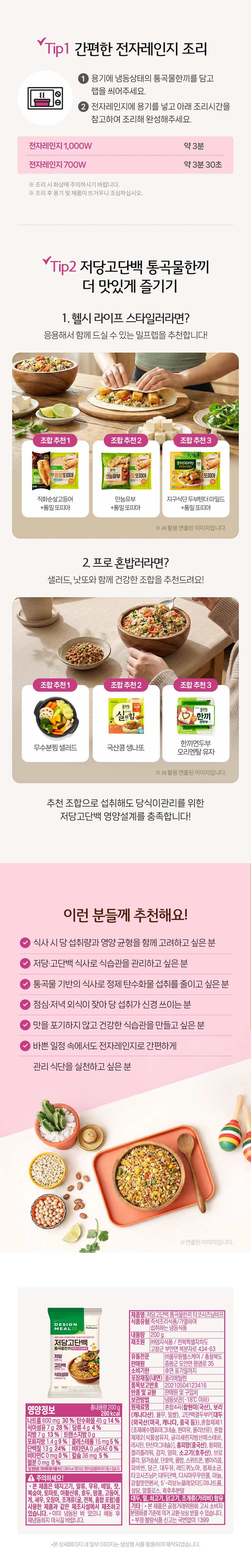 상품설명 상세정보 후기 (0) 기타안내 더보기 제품명 저당고단백통곡물한끼 타코시즈닝비 식품유형 즉석조리식품/가열하여섭취하는 냉동식품 생산자 및 소재지 (주)엄지식품 / 전북특별자치도 고창군 부안면 복분자로 434-63 (수입품의 경우 생산자, 수입자 및 제조국) 해당사항 없습니다. 제조연월일 제품뒷면하단기재 포장단위별 내용물의 용량(중량), 수량 200g 원재료명 상세페이지 참고해주세요. 영양성분 상세페이지 참고해주세요. 유전자변형 식품에 해당하는 경우의 표시 해당사항 없습니다. 소비자 안전을 위한 주의사항 이미 냉동된 바 있으니 해동 후 재냉동시키지 마시길 바랍니다. 수입식품에 해당하는 경우 (수입식품안전관리 특별법에 따른 수입신고를 필함)의 문구 해당사항 없습니다. 소비자상담 관련 전화번호 풀무원 고객기쁨센터 080-800-0434 유통전문판매원 (주)풀무원헬스케어/충청북도 증평군 도안면 원명로35 총 0 건 포토후기 베스트리뷰순 최신순 후기 더보기 배송안내 배송방법 냉동 택배배송 (롯데 일반 택배) 배송비 배송비 3,000원 별도 (4만원 이상 결제 시 무료배송) 배송기간 제품별로 출고처가 다르기 때문에 각각 배송 됩니다. 낮 12시까지 결제 완료 시 2일 후 배송 예정 (주말, 공휴일 제외) ※ 상기 일정은 택배사 사정에 따라 1~2일 차이가 있을 수 있습니다. 주문취소 1. 전체취소 ((가맹점배송)) 주문상품의 첫배송일 3일 전 낮 12시까지 전체 취소가 가능합니다. (토,일 및 공휴일 제외) ((택배배송)) 냉동/냉장/실온 택배 상품은 배송예정일 2일 전 낮 12시까지 전체취소 가능 ((원데이배송)) 주문상품의 배송일 3일 전 낮 12시까지 전체 취소가 가능합니다. (토,일 및 공휴일 제외) 2. 부분취소 ((가맹점배송)) 취소하는 요일과 시간에 따라 부분 취소가 가능합니다. (토,일 및 공휴일 제외) - 낮 12시 이전 취소 요청 시 : 3일 후 배송부터 부분취소 가능 - 낮 12시 이후 취소 요청 시 : 5일 후 배송부터 부분취소 가능 ((냉동/실온 택배배송)) 결제 완료 후 취소 시점에 따라 부분취소가 가능합니다. (주말, 공휴일 제외) - 낮 12시 이전 결제완료 후 취소 요청 시 : 주문마감되어 출고준비 상태로 취소 불가 - 낮 12시 이후 결제완료 후 취소 요청 시 : 익일 낮 12시까지 취소 접수 가능 취소하는 요일과 시간에 따라 부분 취소가 가능합니다. (토,일 및 공휴일 제외) ((원데이배송)) - 낮 12시 이전 취소 요청 시, 3일 후 배송 건부터 부분취소 가능 - 낮 12시 이후 취소 요청 시 : 영업일 기준 4일 후 배송 건부터 부분취소 가능 3. 공통 주문 시 쿠폰을 사용하였을 경우 ‘전체취소’ 시에만 원복 됩니다. 교환/반품안내 교환/반품 신청은 실온 택배배송 상품만 가능합니다. * 상품 불량 외 택배 포장 파손은 교환/반품 사유가 되지 않습니다. - 고객님의 변심에 의한 교환/반품의 경우 반송 택배비를 고객님께서 부담하셔야 합니다. (무료배송 시 왕복택배비) - 임의로 반송하실 경우 환불 등의 처리가 지연될 수 있으므로 반송 전 꼭 1:1문의 또는 고객센터로 접수해 주시기 바랍니다. [반품 가능 조건] 1. 단순변심, 주문착오의 경우 (1) 냉동/냉장/신선 즉섭섭취 상품은 재판매가 불가한 상품 특성 상 반품이 불가합니다. (2) 상온상품은 배송완료 후 7일 이내에 반품 신청이 가능합니다. ※ 고객의 단순변심 또는 주문착오로 인한 반품건의 왕복 배송비는 고객님 부담이며, 상품에 따라 상이 할 수 있습니다. (주문 시 배송비를 결제한 경우 반품 배송비만 부담) ※ 반품한 경우 결제 시 사용 한 쿠폰은 재발행 되지 않습니다. 2. 제품 하자의 경우 반드시 상품의 문제를 확인할 수 있는 사진을 첨부하여 반품 신청하셔야 합니다. *사진 첨부 시, 제품의 유통기한 또는 소비기한을 확인할 수 있는 사진 1장과 제품의 하자가 있는 부분에 대한 사진 1~2장 같이 첨부 (1) 냉동/냉장/신선식품 : 상품을 받은 날로부터 2일 이내 (2) 상온상품 : 상품을 받은 날로부터 3개월 이내 또는 사실을 알게 된 날로부터 30일 이내 ※ 반품 배송비는 디자인밀에서 부담하며 실물 확인 후 환불이 진행됩니다. [반품 신청 방법] 디자인밀 1:1 문의 또는 풀무원 고객기쁨센터로 접수 가능합니다. 임의로 반송하실 경우 환불 등의 처리가 지연될 수 있으므로 반송 전 꼭 고객센터와 확인 후 접수해주시기 바랍니다. ※ 전자상거래 등에서 소비자보호에 관한 법률에 따라 다음의 경우 청약철회가 제한될 수 있습니다. - 일부 주문맞춤 생산되는 상품 (디자인밀 식단형 상품) - 신선(과일,채소등)/냉장/냉동 상품에 대해 시간이 경과 되어 상품등의 가치가 현저히 감소한 경우 - 교환/반품 신청이 상품 수령한 날로부터 7일이 경과한 경우 - 고객님의 사용 또는 일부 소비에 의해 상품의 가치가 훼손된 경우 - 시간 경과에 따라 상품 등의 가치가 현저히 감소하여 재판매가 불가능한 경우 - 고객님이 상품 포장을 개봉하여 사용 또는 설치 완료되어 상품의 가치가 훼손된 경우 (단, 내용 확인을 위한 포장 개봉의 경우는 예외) - 구매한 상품의 구성품이 누락된 경우 (화장품 세트, 사은품 등) - 기타, 상품의 교환, 환불 및 상품 결함 등의 보상은 소비자분쟁해결기준(공정거래위원