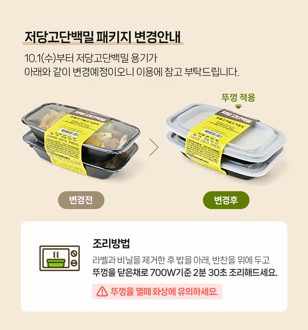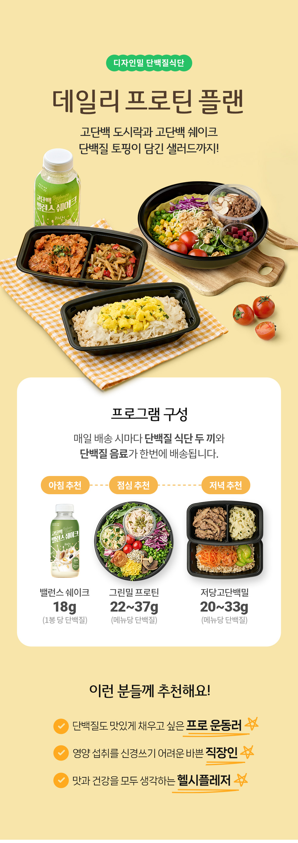 상품설명 상세정보 후기 (6) 기타안내 더보기 그린밀프로틴 상세구성 메뉴 사진을 클릭하면, 더 자세한 정보를 확인하실 수 있습니다. 비트라페&단호박오리구이 적채라페&닭가슴살고구마 칠리빈&통옥수수닭가슴살소세지 당근라페&불고기두부구이 아보카도&달콤닭가슴살 연두부무스&숯불소이불고기 비트무&에그피자 오이타르&닭가슴살 풀드포크&홀그레인양배추 고추라페&고추장제육 양파라페&도토리묵버무리 Prev Next 저당고단백밀 상세구성 메뉴 사진을 클릭하면, 더 자세한 정보를 확인하실 수 있습니다. 숯불소이불고기정식 매콤제육정식 표고버섯소불고기정식 토마토닭볶음정식 대파제육불고기정식 라구파스타정식 토마토스튜&호밀빵 정식 투움바파스타정식 마크니커리스튜정식 매콤두부정식 구운마늘훈제오리정식 동남아풍새우볶음정식 Prev Next 식품의 유형 저당고단백밀:즉석섭취식품 및 즉석조리식품그린밀프로틴:즉석섭취식품밸런스쉐이크:기타가공품 제조원 및 소재지 저당고단백밀, 그린밀프로틴 : (주)우리델리카 / 유통전문 판매원 및 소재지 풀무원식품㈜ / 충북 음성군 대소면 삼양로 730-27 수입품의 경우 수입자 해당사항 없음 제조일자 저당고단백밀,그린밀프로틴:상품 발송일 기준, 2일전 생산된 제품이 배달됩니다./밸런스쉐이크: 수령일 기준 잔여 유통기한 3개월 이상 남은 제품이 배달됩니다. ※주문 이후 각 생산공장에서 가장 최근에 생산된 제품을 준비하여 배송합니다. 소비기한 저당고단백밀:제조시간으로부터 58시간 이내그린밀프로틴:제조시간으로부터 72시간 이내밸런스쉐이크:365일 중량 및 구성 각 메뉴별 상이 원재료 및 함량 각 메뉴별 상세페이지 참조 유전자 재조합식품 여부 해당사항 없음 수입식품:식품위생법에 따른 수입신고 여부 해당사항 없음 고객상담실 연락처 080-800-0434(수신자부담) 유의사항 프로틴 플랜은 단백질 함량이 높게 설계된 제품입니다.열량이 낮게 설계되어 임산부, 수유부는 섭취를 권장하지 않습니다.디자인밀은 1일 1메뉴를 제공하므로, 해당 배송일에 다른 메뉴로 대체는 불가능합니다. 배송일 중 원하지 않는 메뉴가 포함되는 경우, 로그인 후 '마이페이지 > 배송캘린더 > 배송일정 변경' 으로 들어가시면 직접 배송일 변경이 가능합니다. 총 6 건 포토후기 베스트리뷰순 최신순 후기 더보기 배송안내 배송방법 일일배송 (각 지역 풀무원녹즙 가맹점) 또는 택배배송 배송비 일일배달: 무료 (대여용 보냉가방 제공) 택배배송: 배송비 3,000원 별도 (4만원 이상 결제 시 무료배송) 첫 배송일 제품별로 주문일에 따른 첫 배달일이 다르오니 반드시 확인해주세요. 주문&변경 마감은 낮 12시입니다. (토,일,공휴일 제외) ※ 주문이 급증할 경우 조기마감되어 첫 배달일이 변경 될 수 있으며, 개별 안내드립니다. (문자 또는 알림톡) ※ 첫 주문시 가맹점의 모닝스텝이 배달정보 확인을 위해 고객님께 직접 연락드릴 수 있습니다. (전화 또는 문자) 배송시간 가정 배달(주택/아파트) : 배달일 전날 22시~ 당일 오전 8시 사무실 배달(회사/공공기관/상가건물) : 배달 당일 오전 7시 ~ 오전 12시 택배배송 : 롯데 택배 도착시간과 동일 ※ 악천후, 도로사정, 가맹점 상황(물량 급증, 현관출입 불가 등)에 따라 조기/지연 배달될 수 있습니다. 공휴일 배송안내 공휴일은 배송휴무입니다. - 칼로리/영양균형식 : 주문시점에 종료일 뒤로 자동 연장 됨 기타 일일배달이 불가능한 지역인 경우, 부득이하게 주문 취소 또는 택배배송 전환 안내를 드릴 수 있으며 개별 안내드립니다. 주문취소 1. 전체취소 ((가맹점배송)) 주문상품의 첫배송일 3일 전 낮 12시까지 전체 취소가 가능합니다. (토,일 및 공휴일 제외) ((택배배송)) 냉동/냉장/실온 택배 상품은 배송예정일 2일 전 낮 12시까지 전체취소 가능 ((원데이배송)) 주문상품의 배송일 3일 전 낮 12시까지 전체 취소가 가능합니다. (토,일 및 공휴일 제외) 2. 부분취소 ((가맹점배송)) 취소하는 요일과 시간에 따라 부분 취소가 가능합니다. (토,일 및 공휴일 제외) - 낮 12시 이전 취소 요청 시 : 3일 후 배송부터 부분취소 가능 - 낮 12시 이후 취소 요청 시 : 5일 후 배송부터 부분취소 가능 ((냉동/실온 택배배송)) 결제 완료 후 취소 시점에 따라 부분취소가 가능합니다. (주말, 공휴일 제외) - 낮 12시 이전 결제완료 후 취소 요청 시 : 주문마감되어 출고준비 상태로 취소 불가 - 낮 12시 이후 결제완료 후 취소 요청 시 : 익일 낮 12시까지 취소 접수 가능 취소하는 요일과 시간에 따라 부분 취소가 가능합니다. (토,일 및 공휴일 제외) ((원데이배송)) - 낮 12시 이전 취소 요청 시, 3일 후 배송 건부터 부분취소 가능 - 낮 12시 이후 취소 요청 시 : 영업일 기준 4일 후 배송 건부터 부분취소 가능 3. 공통 주문 시 쿠폰을 사용하였을 경우 ‘전체취소’ 시에만 원복 됩니다. 교환/반품안내 교환/반품 신청은 실온 택배배송 상품만 가능합니다. * 상품 불량 외 택배 포장 파손은 교환/반품 사유가 되지 않습니다. - 고객님의 변심에 의한 교환/반품의 경우 반송 택배비를 고객님께서 부담하셔야 합니다. (무료배송 시 왕복택배비) - 임의로 반송하실 경우 환불 등의 처리가 