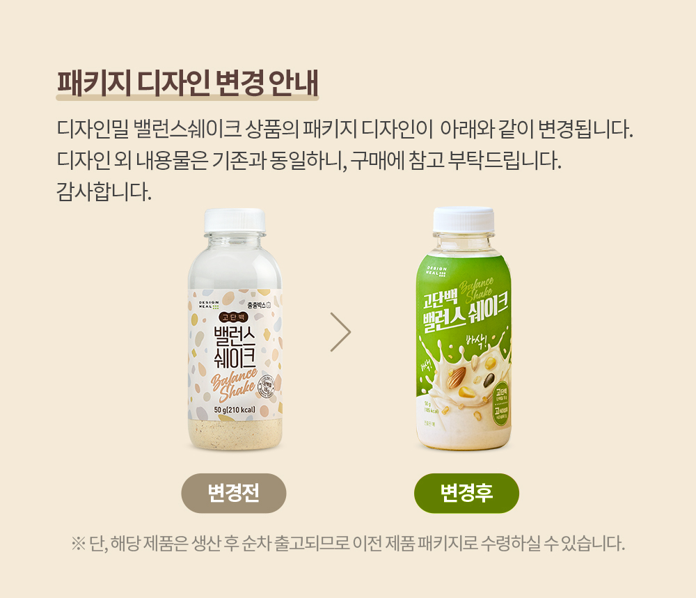 상품설명 상세정보 후기 (21) 기타안내 더보기 밸런스쉐이크 (10입) 상세구성 메뉴 사진을 클릭하면, 더 자세한 정보를 확인하실 수 있습니다. 밸런스쉐이크(50g) Prev Next 식품의 유형 기타가공품 제조원 및 생산자 및 소재지 (주)비엘에프씨/경북 상주시 함창읍 영동길 9-67 유통전문판매원 및 소재지 풀무원식품㈜/충북 음성군 대소면 삼양로 730-27 제조일자 ※ 주문이후 각 생산공장에서 가장 최근에 생산된 제품을 준비하여 신속히 배송하므로, 정확한 제조년월일 안내가 어렵습니다. 소비기한 365일 (제품하단표기) 중량 및 구성 50g*10개입 원재료 및 함량 분리대두단백(싱가포르산), 유청분말(라트비아산), 백태(대두:국산), 현미, 슬로우칼로리슈가-1, 혼합탈지분유, 유기농코코넛꽃즙분말 4%, 난소화성말토덱스트린, 아몬드, 콘푸라이트, 분말유크림, 치커리뿌리추출분말(Orafti CRF), 스위트콘파우더, 검정콩, 해바라기씨, 농축유청단백(WPC), 멥쌀, 현미찹쌀, 멀티비타민미네랄믹스, 흑임자, 효소처리스테비아/ 대두, 우유 함유 섭취량, 섭취방법, 섭취시 주의사항 1병(50g)에 물 또는 우유를 200ml 넣고 잘 흔들어 섞은 후 섭취하십시오.(기호에 따라 물의 양은 조절할 수 있습니다.)<br>본 제품의 섭취량은 성인 기준으로 표시되어 있으며, 섭취자의 연령이나 신체 상태에 따라 제품 섭취량 조절이 가능합니다.<br>*본 제품은 질병의 예방 및 치료를 위한 의약품이 아닙니다 유전자재조합식품 여부 해당사항 없음 영유아식, 체중조절 식품 표시광고 사전심의필 해당사항 없음 수입식품:식품위생법에 따른 수입신고 여부 해당사항 없음 고객상담실 연락처 080-800-0434(수신자부담) 유의사항 디자인밀 칼로리 조절 식단은 임산부, 수유부는 섭취하지 마시기 바랍니다. 임신 초기 식단 구성은 태아 발육 및 골격 형성에 있어 매우 중요하고 수유부 역시 충분한 열량을 섭취해야 하기 때문에 디자인밀 식단을 권장하지 않고 있습니다. 총 21 건 포토후기 베스트리뷰순 최신순 후기 더보기 배송안내 배송방법 택배배송 (롯데 일반 택배) 배송비 배송비 3,000원 별도 (4만원 이상 결제 시 무료배송) 배송기간 제품별로 출고처가 다르기 때문에 각각 배송될 수 있습니다. 낮12시까지 결제 완료 시 2일 후 배송 예정 (주말, 공휴일 제외) ※ 상기 일정은 택배사 사정에 따라 1~2일 차이가 있을 수 있습니다. 주문취소 1. 전체취소 ((가맹점배송)) 주문상품의 첫배송일 3일 전 낮 12시까지 전체 취소가 가능합니다. (토,일 및 공휴일 제외) ((택배배송)) 냉동/냉장/실온 택배 상품은 배송예정일 2일 전 낮 12시까지 전체취소 가능 ((원데이배송)) 주문상품의 배송일 3일 전 낮 12시까지 전체 취소가 가능합니다. (토,일 및 공휴일 제외) 2. 부분취소 ((가맹점배송)) 취소하는 요일과 시간에 따라 부분 취소가 가능합니다. (토,일 및 공휴일 제외) - 낮 12시 이전 취소 요청 시 : 3일 후 배송부터 부분취소 가능 - 낮 12시 이후 취소 요청 시 : 5일 후 배송부터 부분취소 가능 ((냉동/실온 택배배송)) 결제 완료 후 취소 시점에 따라 부분취소가 가능합니다. (주말, 공휴일 제외) - 낮 12시 이전 결제완료 후 취소 요청 시 : 주문마감되어 출고준비 상태로 취소 불가 - 낮 12시 이후 결제완료 후 취소 요청 시 : 익일 낮 12시까지 취소 접수 가능 취소하는 요일과 시간에 따라 부분 취소가 가능합니다. (토,일 및 공휴일 제외) ((원데이배송)) - 낮 12시 이전 취소 요청 시, 3일 후 배송 건부터 부분취소 가능 - 낮 12시 이후 취소 요청 시 : 영업일 기준 4일 후 배송 건부터 부분취소 가능 3. 공통 주문 시 쿠폰을 사용하였을 경우 ‘전체취소’ 시에만 원복 됩니다. 교환/반품안내 교환/반품 신청은 실온 택배배송 상품만 가능합니다. * 상품 불량 외 택배 포장 파손은 교환/반품 사유가 되지 않습니다. - 고객님의 변심에 의한 교환/반품의 경우 반송 택배비를 고객님께서 부담하셔야 합니다. (무료배송 시 왕복택배비) - 임의로 반송하실 경우 환불 등의 처리가 지연될 수 있으므로 반송 전 꼭 1:1문의 또는 고객센터로 접수해 주시기 바랍니다. [반품 가능 조건] 1. 단순변심, 주문착오의 경우 (1) 냉동/냉장/신선 즉섭섭취 상품은 재판매가 불가한 상품 특성 상 반품이 불가합니다. (2) 상온상품은 배송완료 후 7일 이내에 반품 신청이 가능합니다. ※ 고객의 단순변심 또는 주문착오로 인한 반품건의 왕복 배송비는 고객님 부담이며, 상품에 따라 상이 할 수 있습니다. (주문 시 배송비를 결제한 경우 반품 배송비만 부담) ※ 반품한 경우 결제 시 사용 한 쿠폰은 재발행 되지 않습니다. 2. 제품 하자의 경우 반드시 상품의 문제를 확인할 수 있는 사진을 첨부하여 반품 신청하셔야 합니다. *사진 첨부 시, 제품의 유통기한 또는 소비기한을 확인할 수 있는 사진 1장과 제품의 하자가 있는 부분에 대한 사진 1~2장 같이 첨부 (1) 냉동/냉장/신선식품 : 상품을 받은 날로부터 2일 이내 (2) 상온상품 : 상품을 받은 날로부터 3개월 이내 또는 사실을 알게 된 날로부터 30일 이내 ※ 반품 배송비는 디자인밀에서 부담하며 실물 확인 후 환불이 진행됩니다. [반품 신청 방법] 디자인밀 1:1 문의 또는 풀무원 고객기쁨센터로 접수 