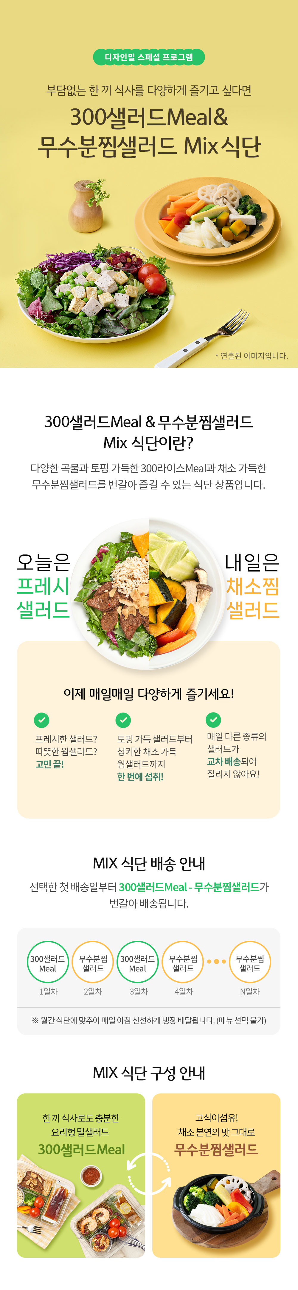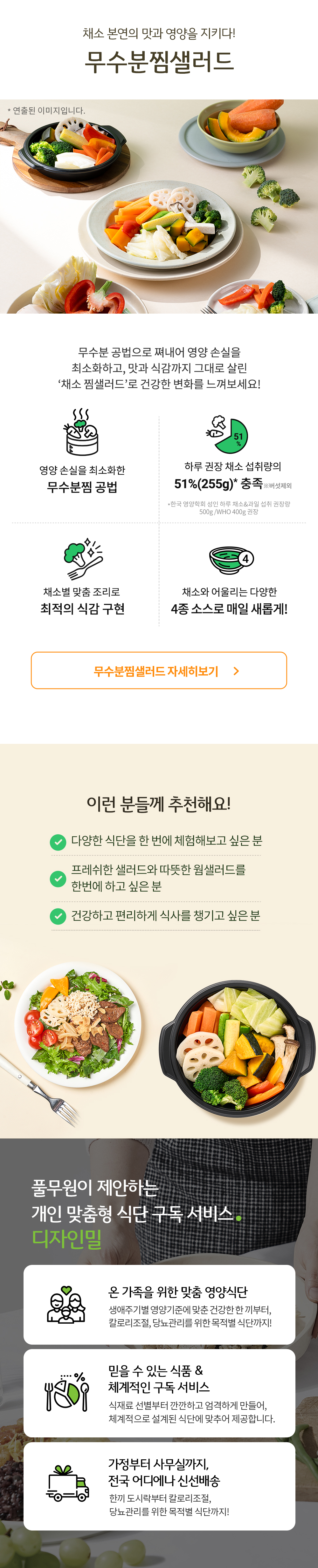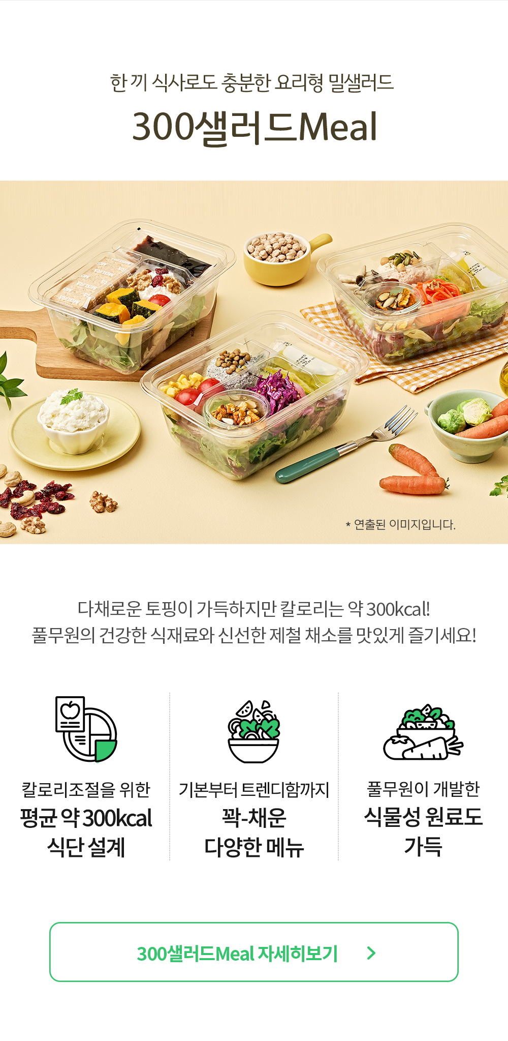 상품설명 상세정보 후기 (9) 기타안내 더보기 300샐러드Meal 상세구성 메뉴 사진을 클릭하면, 더 자세한 정보를 확인하실 수 있습니다. 그릴드베지두부텐더샐러드 숯불소이불고기유부채샐러드 베이컨&그릴드베지샐러드 보코치니단호박샐러드 칠리빈닭가슴살소시지샐러드 바싹불고기귀리샐러드 닭가슴살고구마샐러드 리코타통밀크레커샐러드 비트무샐러드 당근귀리무스샐러드 적채렌틸콩무스샐러드 Prev Next 무수분찜샐러드 상세구성 메뉴 사진을 클릭하면, 더 자세한 정보를 확인하실 수 있습니다. 참깨쯔유찜샐러드 갈릭오일찜샐러드 칠리오일찜샐러드 버진올리브유찜샐러드 K스파이시찜샐러드 피넛버터찜샐러드 Prev Next 식품의 유형 300샐러드(즉석섭취식품),무수분찜샐러드(즉석조리식품) 제조원 및 생산자/소재지 (주)우리델리카 / 충청북도 진천군 덕산읍 신척산단 4로 6 유통전문 판매원 및 소재지 풀무원식품㈜/충북 음성군 대소면 삼양로 730-27 제조일자 상품 발송일 기준, 2일전 생산된 제품이 배달됩니다. ※ 주문 이후 각 생산공장에서 가장 최근에 생산된 제품을 준비하여 배송합니다. 소비기한 제조 시간으로부터 72시간 중량 및 구성 각 제품별 상이 원재료 및 함량 각 메뉴별 상세페이지 참조 유전자 재조합식품 여부 해당사항 없음 수입식품: 식품위생법에 따른 수입신고 여부 해당사항 없음 고객상담실 연락처 풀무원 고객기쁨센터 080-800-0434(수신자부담) 총 9 건 포토후기 베스트리뷰순 최신순 후기 더보기 배송안내 배송방법 새벽택배 (수도권, 충청 일부 지역) 또는 가맹점배송 (각 지역 풀무원녹즙 가맹점) 배송비 무료 (종이박스 배송) 첫 배송일 제품별로 주문일에 따른 첫 배달일이 다르오니 반드시 확인해주세요. 주문&변경 마감은 낮 12시입니다. (토,일,공휴일 제외) ※ 주문이 급증할 경우 조기마감되어 첫 배달일이 변경 될 수 있으며, 개별 안내드립니다. (문자 또는 알림톡) ※ 첫 주문시 가맹점의 모닝스텝이 배달정보 확인을 위해 고객님께 직접 연락드릴 수 있습니다. (전화 또는 문자) 배송형태 1. 새벽택배 2일치 식단이 한 번에 배송됩니다. 2. 가맹점배송 1일치 식단이 배송됩니다. 배송시간 1. 새벽택배 오전 7시 이전 도착 예정 2. 가맹점배송 가정 배달(주택/아파트) : 배달일 전날 12시~ 당일 오전 7시 사무실 배달(회사/공공기관/상가건물) : 배달 당일 오전 8시 ~ 오전 11시 ※ 악천후, 도로사정, 가맹점 상황(물량 급증, 현관출입 불가 등)에 따라 조기/지연 배달될 수 있습니다. 공휴일 배송안내 공휴일은 배송휴무입니다. - 칼로리/영양균형식 : 주문시점에 종료일 뒤로 자동 연장 됨 기타 가맹점배송 또는 새벽택배 배송이 불가능한 지역인 경우, 부득이하게 주문이 취소 될 수 있으며 개별 안내드립니다. 주문취소 1. 전체취소 ((가맹점배송)) 주문상품의 첫배송일 3일 전 낮 12시까지 전체 취소가 가능합니다. (토,일 및 공휴일 제외) ((택배배송)) 냉동/냉장/실온 택배 상품은 배송예정일 2일 전 낮 12시까지 전체취소 가능 ((원데이배송)) 주문상품의 배송일 3일 전 낮 12시까지 전체 취소가 가능합니다. (토,일 및 공휴일 제외) 2. 부분취소 ((가맹점배송)) 취소하는 요일과 시간에 따라 부분 취소가 가능합니다. (토,일 및 공휴일 제외) - 낮 12시 이전 취소 요청 시 : 3일 후 배송부터 부분취소 가능 - 낮 12시 이후 취소 요청 시 : 5일 후 배송부터 부분취소 가능 ((냉동/실온 택배배송)) 결제 완료 후 취소 시점에 따라 부분취소가 가능합니다. (주말, 공휴일 제외) - 낮 12시 이전 결제완료 후 취소 요청 시 : 주문마감되어 출고준비 상태로 취소 불가 - 낮 12시 이후 결제완료 후 취소 요청 시 : 익일 낮 12시까지 취소 접수 가능 취소하는 요일과 시간에 따라 부분 취소가 가능합니다. (토,일 및 공휴일 제외) ((원데이배송)) - 낮 12시 이전 취소 요청 시, 3일 후 배송 건부터 부분취소 가능 - 낮 12시 이후 취소 요청 시 : 영업일 기준 4일 후 배송 건부터 부분취소 가능 3. 공통 주문 시 쿠폰을 사용하였을 경우 ‘전체취소’ 시에만 원복 됩니다. 교환/반품안내 교환/반품 신청은 실온 택배배송 상품만 가능합니다. * 상품 불량 외 택배 포장 파손은 교환/반품 사유가 되지 않습니다. - 고객님의 변심에 의한 교환/반품의 경우 반송 택배비를 고객님께서 부담하셔야 합니다. (무료배송 시 왕복택배비) - 임의로 반송하실 경우 환불 등의 처리가 지연될 수 있으므로 반송 전 꼭 1:1문의 또는 고객센터로 접수해 주시기 바랍니다. [반품 가능 조건] 1. 단순변심, 주문착오의 경우 (1) 냉동/냉장/신선 즉섭섭취 상품은 재판매가 불가한 상품 특성 상 반품이 불가합니다. (2) 상온상품은 배송완료 후 7일 이내에 반품 신청이 가능합니다. ※ 고객의 단순변심 또는 주문착오로 인한 반품건의 왕복 배송비는 고객님 부담이며, 상품에 따라 상이 할 수 있습니다. (주문 시 배송비를 결제한 경우 반품 배송비만 부담) ※ 반품한 경우 결제 시 사용 한 쿠폰은 재발행 되지 않습니다. 2. 제품 하자의 경우 반드시 상품의 문제를 확인할 수 있는 사진을 첨부하여 반품 신청하셔야 합니다. *사진 첨부 시, 제품의 유통기한 또는 소비기한을 확인할 수 