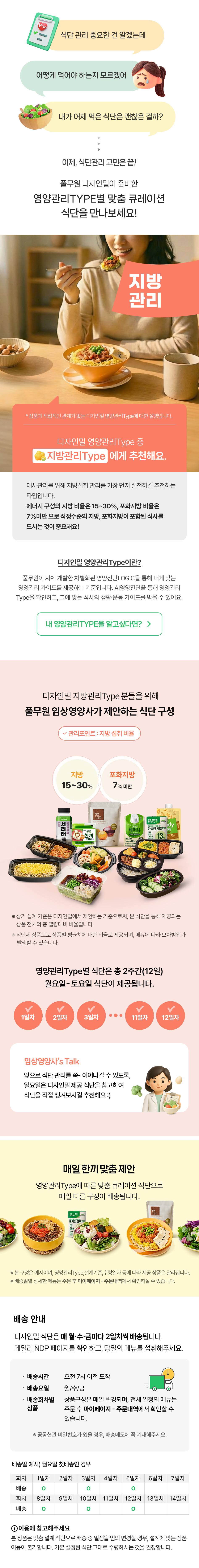 상품설명 상세정보 후기 (0) 기타안내 더보기 지방관리Type 큐레이션 식단 상세구성 이미지를 클릭하면, 더 자세한 정보를 확인하실 수 있습니다. 소이짜장스크램블밥 닭가슴살소세지오므라이스 토마토양배추스테이크 숯불닭구이 정식 큐브스테이크 정식 씨앗강된장 정식 두부제육 정식 바싹소불고기 비빔밥 표고버섯소불고기정식 대파제육불고기정식 토마토스튜&호밀빵 정식 미니샐러드 레드 미니샐러드 레드 미니샐러드 옐로우 미니샐러드 옐로우 미니샐러드 그린 미니샐러드 그린 미니샐러드 그린 고추라페&고추장제육 마크니커리스튜정식 칠리오일찜샐러드 칠리두부강정크림필라프 김치제육완두콩계란덮밥 적채렌틸콩무스샐러드 동남아풍새우볶음정식 매쉬드두부토마토커리 숯불소이무나물비빔밥 궁중찜닭정식 시래기비빔밥 Prev Next 서리태 콩즙두유 (단품) 케어유 고단백 균형영양식 케어유 고단백 당뇨영양식 국산콩생나또 찐밤 그대로 핸디밀포켓쉐이크 고소한맛50g 단백한하루 렌틸콩 당제로 Prev Next 식품의 유형 상품 상세 정보를 참고하세요. 제조원 및 생산자/소재지 상품 상세 정보를 참고하세요. 유통전문 판매원 및 소재지 상품 상세 정보를 참고하세요. 제조일자 식단은 상품 발송일 기준, 2일전 생산된 제품이 배달됩니다. ※ 주문 이후 각 생산공장에서 가장 최근에 생산된 제품을 준비하여 배송합니다. <br> 국산생나또,한끼연두부,구운란은 상품 발송일을 기준으로 소비기한이 5일 이상 남은 제품이 배송됩니다. 그 외 제품은 상품 발송일을 기준으로 소비기한이 30일 이상 남은 상품만을 판매합니다. ※ 뉴트리션디자인프로그램은 각 상품마다 배송되는 상품이 상이합니다. 소비기한 300샐러드Meal/무수분찜샐러드/그린밀프로틴 : 제조시간으로부터 72시간, 300라이스Meal,저당고단백밀,정성한상&미니샐러드 : 제조시간으로부터 58시간, 그 외 제품은 상품 상세 정보를 확인해주세요. 중량 및 구성 각 제품별 상이 원재료 및 함량 각 메뉴별 상세페이지 참조 유전자 재조합식품 여부 해당사항 없음 수입식품: 식품위생법에 따른 수입신고 여부 해당사항 없음 고객상담실 연락처 풀무원 고객기쁨센터 080-800-0434(수신자부담) 총 0 건 포토후기 베스트리뷰순 최신순 후기 더보기 배송안내 배송방법 새벽택배 (서울 전지역) 배송비 무료 (종이박스 배송) 첫 배송일 고객님이 선택하신 프로그램 시작일에 맞추어 배송됩니다. 단, 뉴트리션 디자인 프로그램 구매 시, 사전패키지 (가이드&연속혈당측정기)는 프로그램 시작일로부터 2일 전 배송됩니다. (월요일 배송인 경우, 금요일 배송) ※ 주문이 급증할 경우 조기마감되어 프로그램 시작일이 변경 될 수 있으며, 개별 안내드립니다. (문자 또는 알림톡) 배송변경 본 상품은 관리형 프로그램으로 선택하신 이용일 그대로 이용하시길 권장합니다. 단, 부득이한 사정으로 식단 수령일의 변경이 필요한 경우, 프로그램 시작일로부터 3주(21일) 이내 일정에서 변경이 가능합니다. 배송형태 2일치 식단이 한 번에 배송 됩니다. 배송시간 오전 7시 이전 도착 예정 ※ 악천후, 도로상황에 따라 지연 배달될 수 있습니다. 공휴일 배송안내 공휴일은 배송휴무입니다. 주문 시점에 종료일 뒤로 자동 연장 및 변경되어 배송일이 설정됩니다. 주문취소 1. 전체취소 주문상품의 프로그램 시작일 4일 전 낮 12시까지 전체 취소가 가능합니다. (토,일 및 공휴일 제외) 2. 부분취소 본 상품은 이용 중 부분 취소는 불가합니다. 3. 공통 주문 시 쿠폰을 사용하였을 경우 ‘전체취소’ 시에만 원복 됩니다. 연속혈당측정기 센서 오류가 있는 경우 *리브레 앱 좌측 상단에 있는 메뉴에서 아래 화면 캡처 ① 센서 serial number(메뉴-정보), ② 오류 증상 화면(메뉴-도움말-이벤트로그) ③ 부착 일자(메뉴-도움말-이벤트로그 내 새로운 센서 발견 메시지 참조) 다음의 경우는 교환 및 환불이 불가합니다. 1. 구매자의 과실로 기기가 파손, 훼손된 경우 2. 센서 오류 메시지 확인이 어려워 센서 오류 판단이 어려운 경우 3. 구매자의 과실로 센서가 떨어져 재사용이 어려운 경우 교환/반품안내 교환/반품 신청은 실온 택배배송 상품만 가능합니다. * 상품 불량 외 택배 포장 파손은 교환/반품 사유가 되지 않습니다. - 고객님의 변심에 의한 교환/반품의 경우 반송 택배비를 고객님께서 부담하셔야 합니다. (무료배송 시 왕복택배비) - 임의로 반송하실 경우 환불 등의 처리가 지연될 수 있으므로 반송 전 꼭 1:1문의 또는 고객센터로 접수해 주시기 바랍니다. [반품 가능 조건] 1. 단순변심, 주문착오의 경우 (1) 냉동/냉장/신선 즉섭섭취 상품은 재판매가 불가한 상품 특성 상 반품이 불가합니다. (2) 상온상품은 배송완료 후 7일 이내에 반품 신청이 가능합니다. ※ 고객의 단순변심 또는 주문착오로 인한 반품건의 왕복 배송비는 고객님 부담이며, 상품에 따라 상이 할 수 있습니다. (주문 시 배송비를 결제한 경우 반품 배송비만 부담) ※ 반품한 경우 결제 시 사용 한 쿠폰은 재발행 되지 않습니다. 2. 제품 하자의 경우 반드시 상품의 문제를 확인할 수 있는 사진을 첨부하여 반품 신청하셔야 합니다. *사진 첨부 시, 