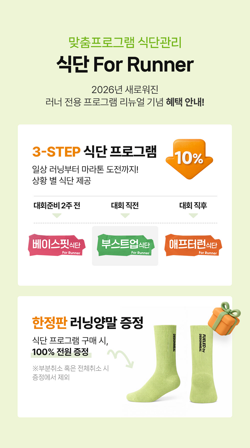 상품설명 상세정보 후기 (2) 기타안내 마라톤 준비를 위한 리뉴얼 기념 혜택!10% 할인 + 100% 한정판 러닝양말 증정까지!지금 만나보세요 (보러가기)(기간: 2026.02.25~2026.03.25) 더보기 300라이스Meal 상세구성 이미지를 클릭하면, 더 자세한 정보를 확인하실 수 있습니다. 로스팅버섯강된장 소이짜장스크램블밥 닭가슴살소세지오므라이스 토마토양배추스테이크 칠리두부강정크림필라프 김치제육완두콩계란덮밥 소이불고기토마토야채덮밥 바질페스토새우덮밥 매쉬드두부토마토커리 일식돼지고기덮밥 Prev Next 정성한상 상세구성 이미지를 클릭하면, 더 자세한 정보를 확인하실 수 있습니다. 두툼떡갈비 정식 소불고기전골 정식 숯불닭구이 정식 큐브스테이크 정식 씨앗강된장 정식 두부제육 정식 바싹소불고기 비빔밥 간장찜닭 정식 오리바베큐 정식 통채소새우카레 정식 마파두부 정식 달래장 비빔밥 표고냉이비빔밥 해초참치비빔밥 함박스테이크정식 숯불소이무나물비빔밥 시래기비빔밥 두부라구정식 만두버섯전골정식 Prev Next 저당고단백밀 상세구성 이미지를 클릭하면, 더 자세한 정보를 확인하실 수 있습니다. 표고버섯소불고기정식 토마토닭볶음정식 대파제육불고기정식 라구파스타정식 토마토스튜&호밀빵 정식 투움바파스타정식 마크니커리스튜정식 구운마늘훈제오리정식 동남아풍새우볶음정식 궁중찜닭정식 라구미트볼정식 두부치즈그라탕정식 어향가지볶음정식 Prev Next 제품명 상단 상품명을 참조하세요. 식품의 유형 상품 상세 정보를 참조하세요. 생산자 및 소재지(수입품의 경우 생산자, 수입자 및 제조국) 상품 상세 정보를 참조하세요. 제조연월일, 소비기한 또는 품질유지기한 상품 발송일을 기준으로 소비기한이 30일 이상 남은 상품만을 판매합니다. 포장단위별 내용물의 용량(중량), 수량 상품 상세 정보를 참고하세요. 원재료명 및 함량(농수산물의 원산지 표시에 관한 법률에 따른 원산지 표시 포함) 상품 상세 정보를 참고하세요. 영양성분(영양성분 표시대상 식품에 한함) 상품 상세 정보를 참고하세요. 유전자변형식품에 해당하는 경우의 표시 해당사항 없습니다. 소비자 안전을 위한 주의사항 상품 상세 정보를 참고하세요. 수입식품인 경우 수입신고 여부 상품 상세 정보를 참고하세요. 소비자상담 관련 전화번호 풀무원 고객기쁨센터 080-800-0455(수신자부담) 총 2 건 포토후기 베스트리뷰순 최신순 후기 더보기 배송안내 배송방법 새벽택배 (서울 전지역) 또는 가맹점배송 (각 지역 풀무원녹즙 가맹점) 배송비 무료 (종이박스 배송) 첫 배송일 제품별로 주문일에 따른 첫 배달일이 다르오니 반드시 확인해주세요. 주문&변경 마감은 낮 12시입니다. (토,일,공휴일 제외) ※ 주문이 급증할 경우 조기마감되어 첫 배달일이 변경 될 수 있으며, 개별 안내드립니다. (문자 또는 알림톡) ※ 첫 주문시 가맹점의 모닝스텝이 배달정보 확인을 위해 고객님께 직접 연락드릴 수 있습니다. (전화 또는 문자) 배송변경 디자인밀 식단형 상품의 첫배송일은 주문일로부터 30일 이내 선택, 이용 중 변경은 첫배송일로부터 +100일 이내 일정에서 변경 가능합니다. 배송형태 1. 새벽택배 2일치 식단이 한 번에 배송됩니다. 2. 가맹점배송 1일치 식단이 배송됩니다. 배송시간 1. 새벽택배 오전 7시 이전 도착 예정 2. 가맹점배송 가정 배달(주택/아파트) : 배달일 전날 12시~ 당일 오전 7시 사무실 배달(회사/공공기관/상가건물) : 배달 당일 오전 8시 ~ 오전 11시 ※ 악천후, 도로사정, 가맹점 상황(물량 급증, 현관출입 불가 등)에 따라 조기/지연 배달될 수 있습니다.무입니다. 공휴일 배송안내 공휴일은 배송휴무입니다. - 칼로리/영양균형식 : 주문시점에 종료일 뒤로 자동 연장 됨 기타 가맹점배송 또는 새벽택배 배송이 불가능한 지역인 경우, 부득이하게 주문이 취소 될 수 있으며 개별 안내드립니다. 주문취소 1. 전체취소 ((가맹점배송)) 주문상품의 첫배송일 3일 전 낮 12시까지 전체 취소가 가능합니다. (토,일 및 공휴일 제외) ((택배배송)) 냉동/냉장/실온 택배 상품은 배송예정일 2일 전 낮 12시까지 전체취소 가능 ((원데이배송)) 주문상품의 배송일 3일 전 낮 12시까지 전체 취소가 가능합니다. (토,일 및 공휴일 제외) 2. 부분취소 ((가맹점배송)) 취소하는 요일과 시간에 따라 부분 취소가 가능합니다. (토,일 및 공휴일 제외) - 낮 12시 이전 취소 요청 시 : 3일 후 배송부터 부분취소 가능 - 낮 12시 이후 취소 요청 시 : 5일 후 배송부터 부분취소 가능 ((냉동/실온 택배배송)) 결제 완료 후 취소 시점에 따라 부분취소가 가능합니다. (주말, 공휴일 제외) - 낮 12시 이전 결제완료 후 취소 요청 시 : 주문마감되어 출고준비 상태로 취소 불가 - 낮 12시 이후 결제완료 후 취소 요청 시 : 익일 낮 12시까지 취소 접수 가능 취소하는 요일과 시간에 따라 부분 취소가 가능합니다. (토,일 및 공휴일 제외) ((원데이배송)) - 낮 12시 이전 취소 요청 시, 3일 후 배송 건부터 부분취소 가능 - 낮 12시 이후 취소 요청 시 : 영업일 기준 4일 후 배송 건부터 부분취소 가능 3. 공통 주문 시 쿠폰을 사용하였을 경우 ‘전체취소’ 시에만 원복 됩니다. 교환/반품안내 